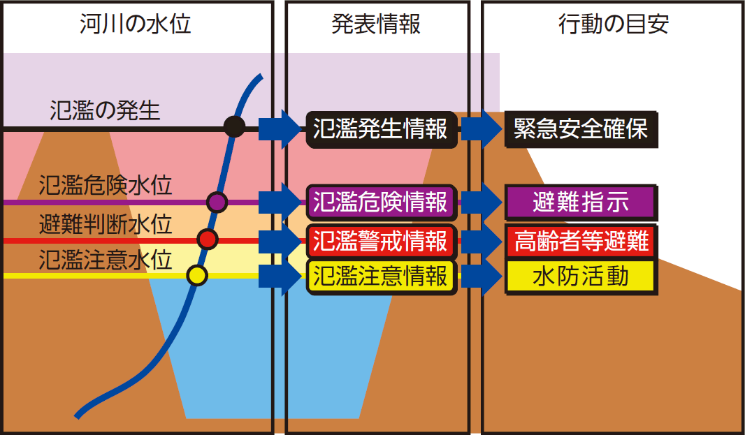 (1)洪水予報 水位の状態に応じて避難判断の目安となる洪水予報を発表します。洪水予報で発表する情報は以下の通りです。